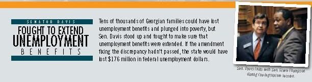 - Sponsored HB 500, the Employment Readiness Program, preserving over $176 million in unemployment benefits for more than 22,000 Georgians during the Great Recession.